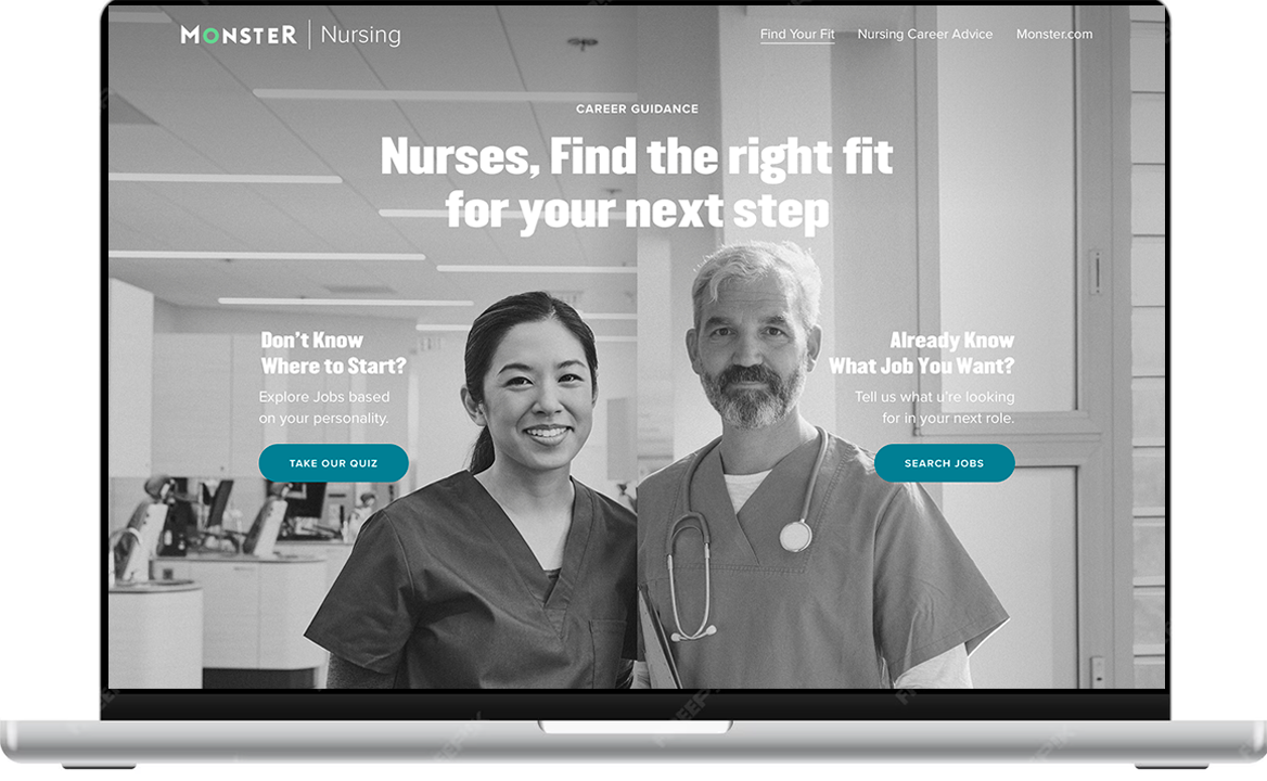 Monster.com asked us to create a series of landing pages customized for popular careers. The first one? Nursing. We started by listening to nurses—interviewing them, building personas, and white-boarding ideas to understand what would help them most. This eventually became an easy-to-use robust hub with engaging tools and ways to find jobs that were relevant to wherever they were in their career journey.