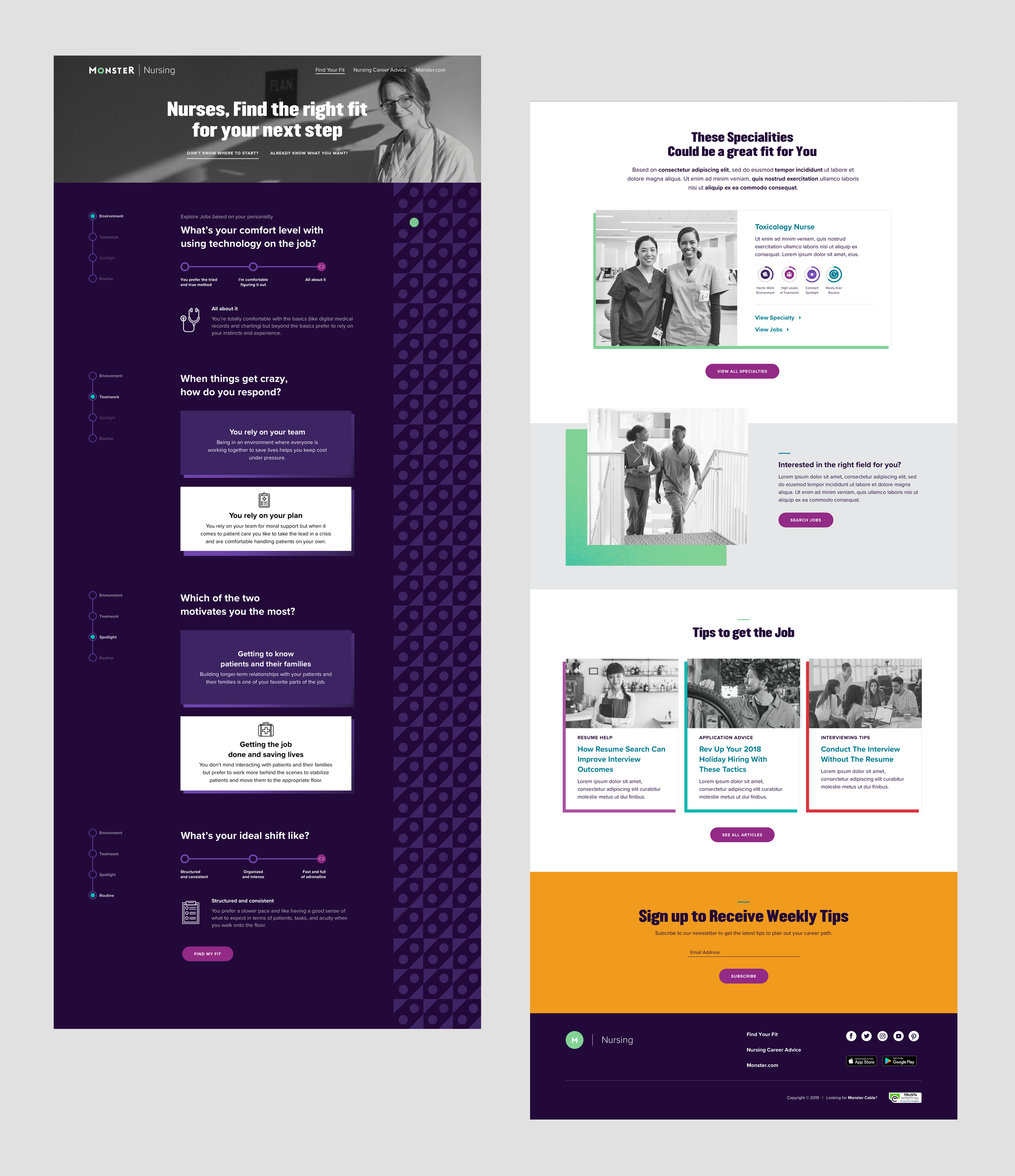 This project required a whole team effort from account, dev, content, UX & UI design, and strategy. Ultimately we built an experience that featured a nursing specialty quiz, speciality subpages with tons of day-to-day details, and nursing specific articles. We also focused on the KPI’s: account creations, application starts, and lead gens. Below is a quick glimpse into how it all went down.